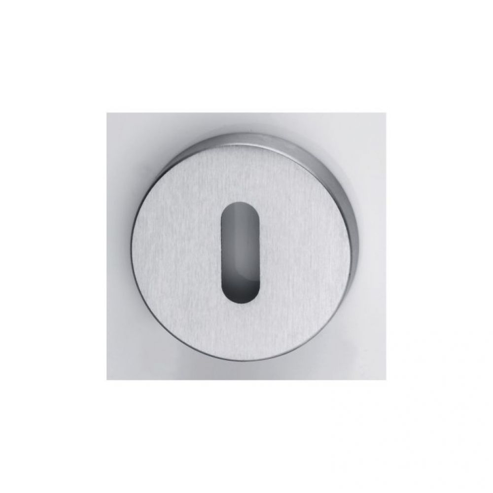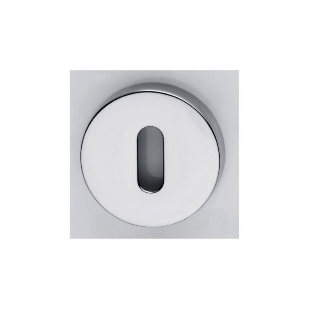 Concealed fix Diffusione Nuovo round escutcheon, available in a polished chrome or satin chrome finish. Used as a decorative and secure surround for standard UK locks. Two escutcheons are required to complete both sides of one door.